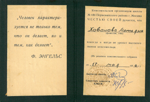 Now I am ready to translate the right-hand side, which said: "The Komsomol organization of Moscow School No. 444 PLEDGES ON ITS HONOR that Tanya Khovanova will never, ever, anywhere disgrace the high calling of a Komsomol member."